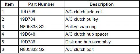NOTE: Internal A/C compressor components are not serviced separately. The FS-10 A/C compressor is serviced only as an assembly. The A/C clutch pulley, A/C clutch field coil (19D798) and the shaft seal are serviceable.